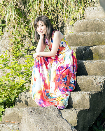 La cover représente Megumi allongée dans l’herbe devant un paysage en ruine. Cette photo a été faite sue l’île artificielle d’Hashima. Cet endroit est mondialement connu pour être une ville/île totalement abandonnée.
